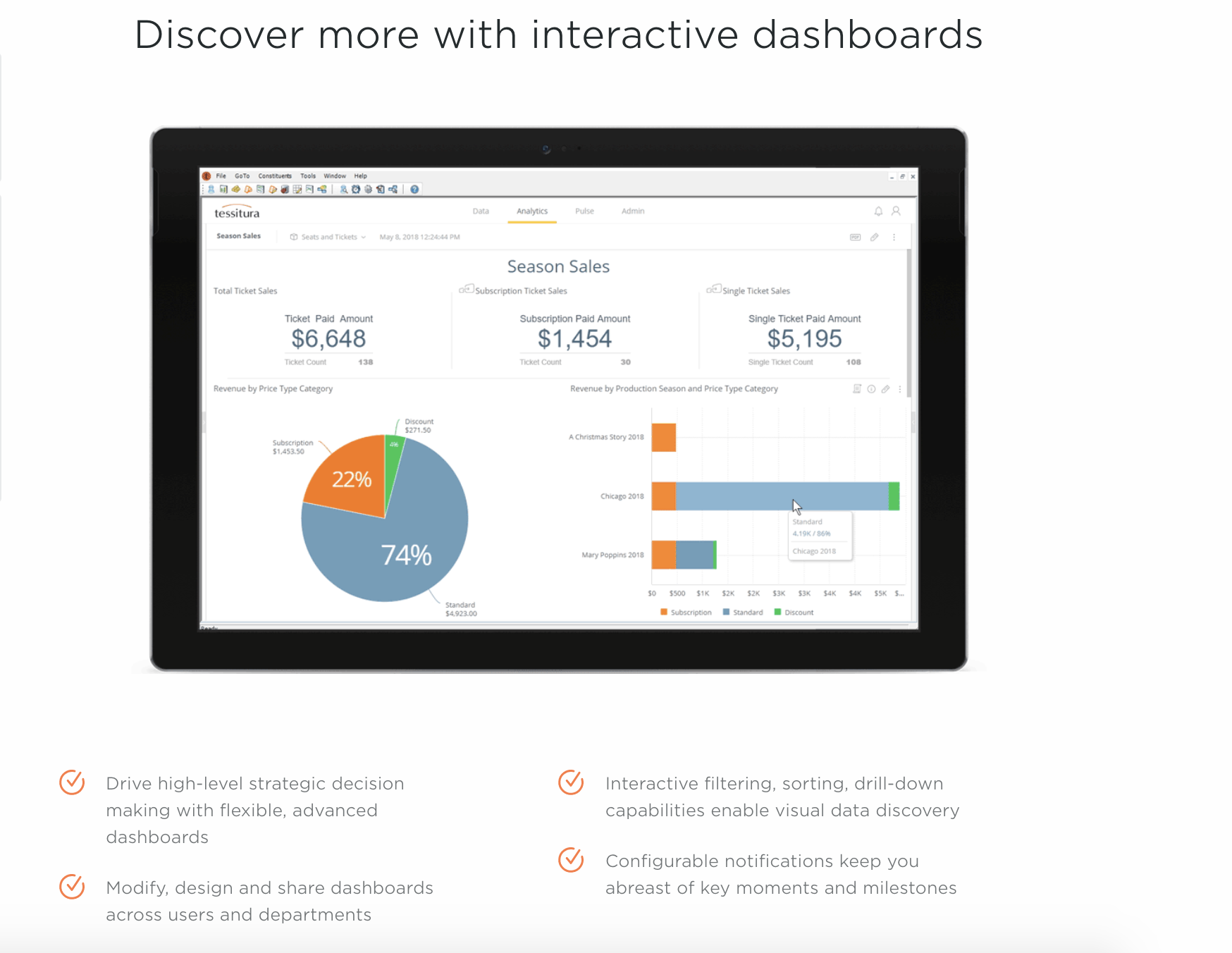 Here’s a great example of how our customer, Tessitura Network whit-labeled our embedded analytics solution to turn analytics into action and through interactivity on mobile and desktop.