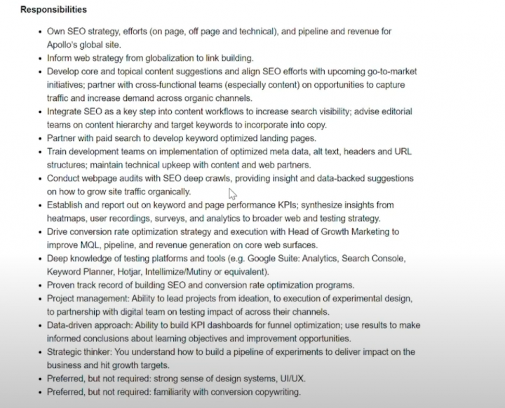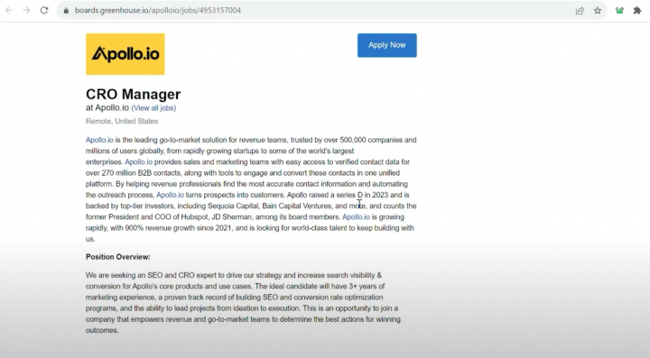 So looking at Apollo’s jobs posts, you can see that they have open jobs for SEO strategy, account management, security and compliance. These are probably areas that Apollo is focused on strategically.