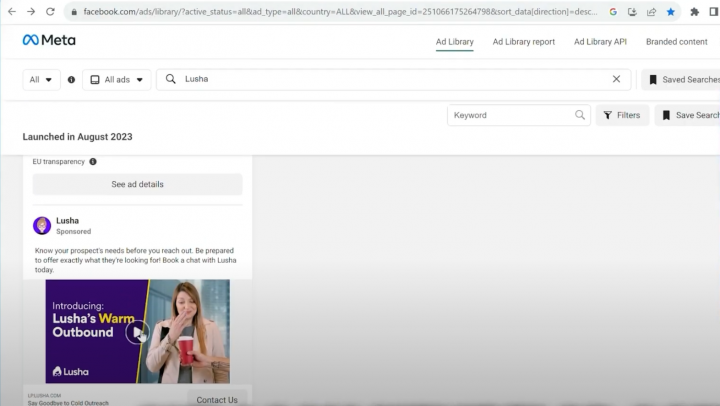 I could go to the Facebook ads library and I can see Lusha’s ad copy and ad videos. I can see what their branding is like and how they’re communicating with users.