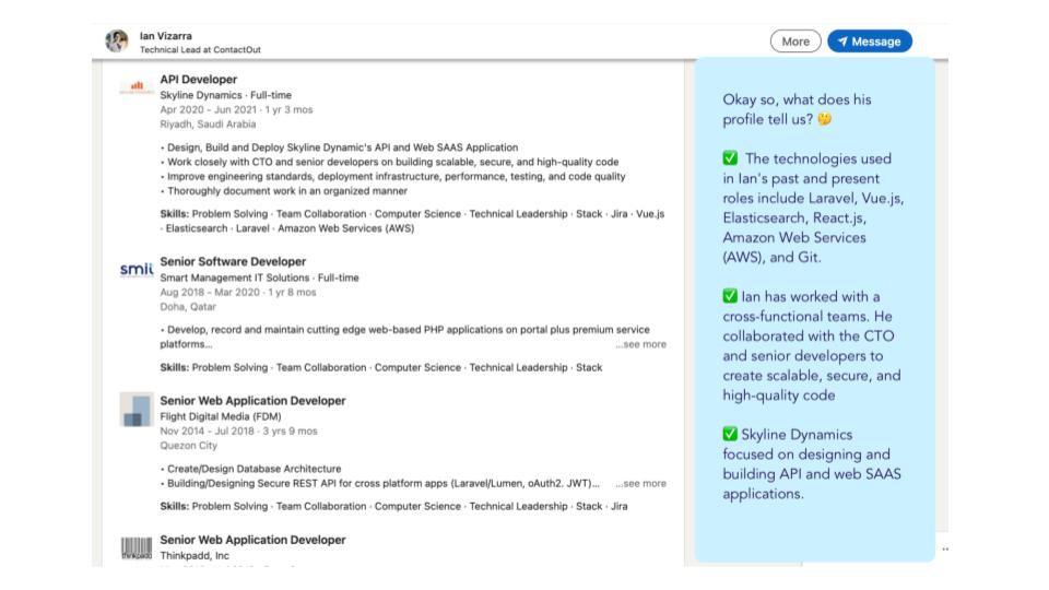 The first one is by doing a classic Boolean search into Google to find software engineers that meet our qualifications > head to their LinkedIn > use ContactOut to get in touch with them.