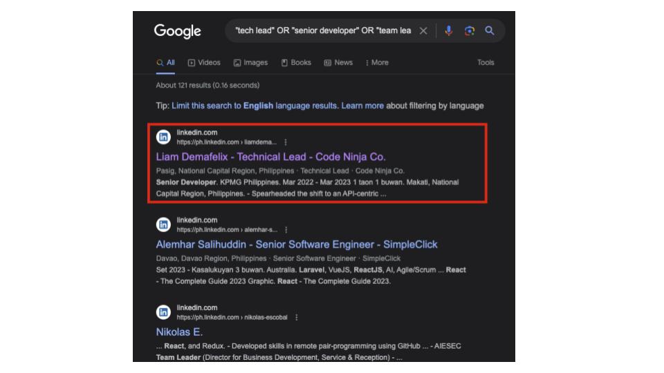 “tech lead” OR “senior developer” OR “team leader” “(React” OR “reactjs” AND “laravel)” AND “saas” -“contactout” -intitle:”profiles” -inurl:”dir/ ” site:ph.linkedin.com/in/ OR site:ph.linkedin.com/pub/