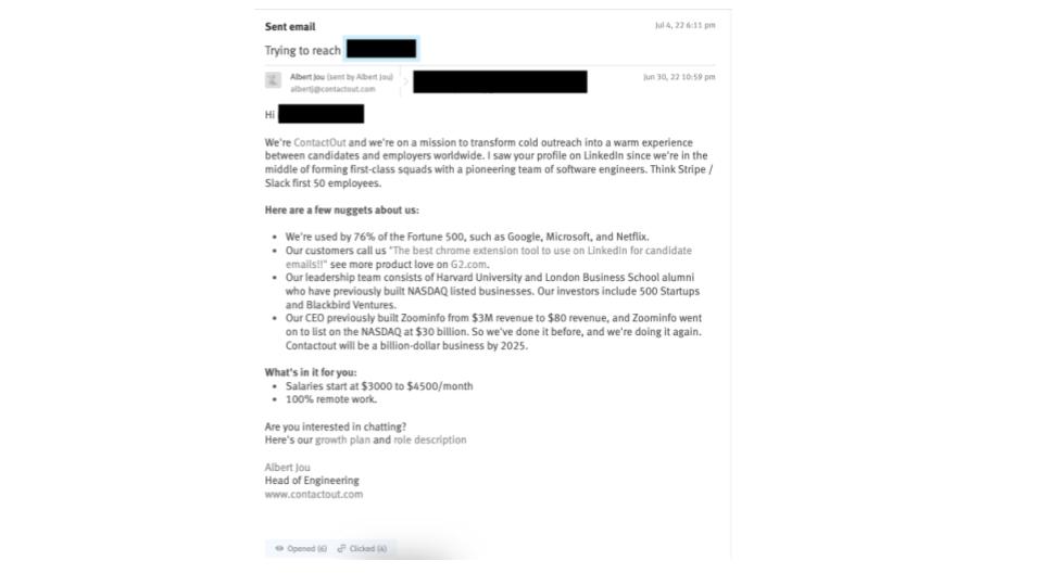Finding talent is half the battle – getting their attention in a world where their inbox is brimming with opportunities is another hurdle. This leads me to our go-to method for standing out in a sea of emails: a personalized approach, where our leaders actively “reach out” to potential candidates while recruiters manage the back end (e.g. responding to emails, screening profiles, and arranging interviews)