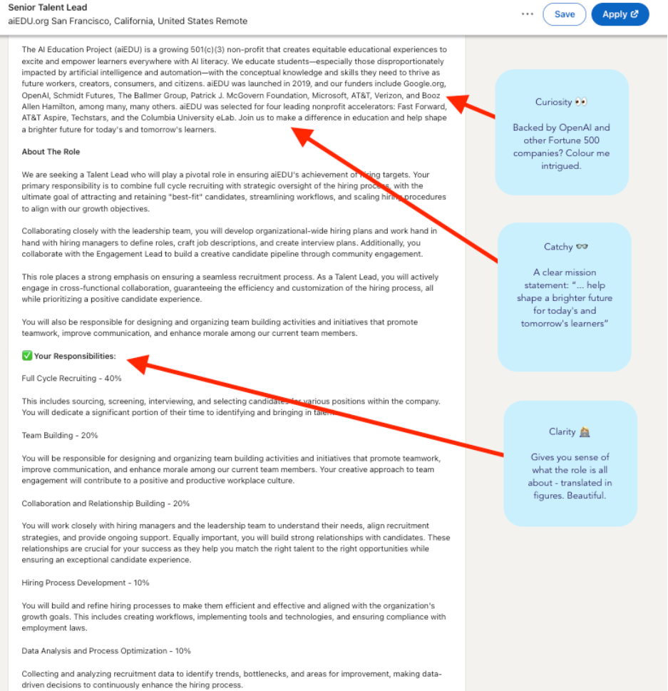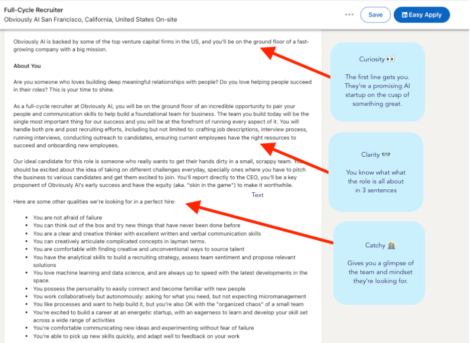 Many JDs fall into the trap of being overly catchy, risking the perception of clickbait, or overly curious, which can come across as too good to be true.