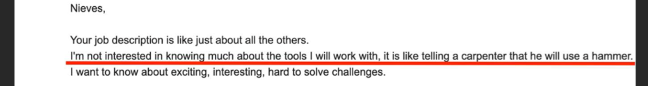 Setting aside that element of delight, we recognize that it takes hours of research to make a personalized email, so let’s approach this from a bird’s eye POV. What are candidates really looking for when they read your email?