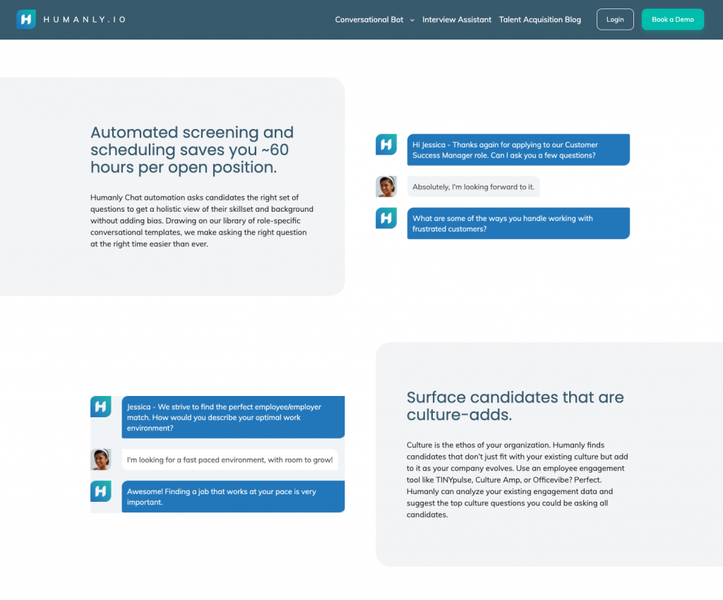 An AI chatbot from Humanly.io is deployed on the company’s careers page. The Ai chatbot answers queries from potential candidates, provides information about the company culture, and even assists in scheduling preliminary interviews. This 24/7 availability enhances the candidate experience, ensuring they feel valued and informed.