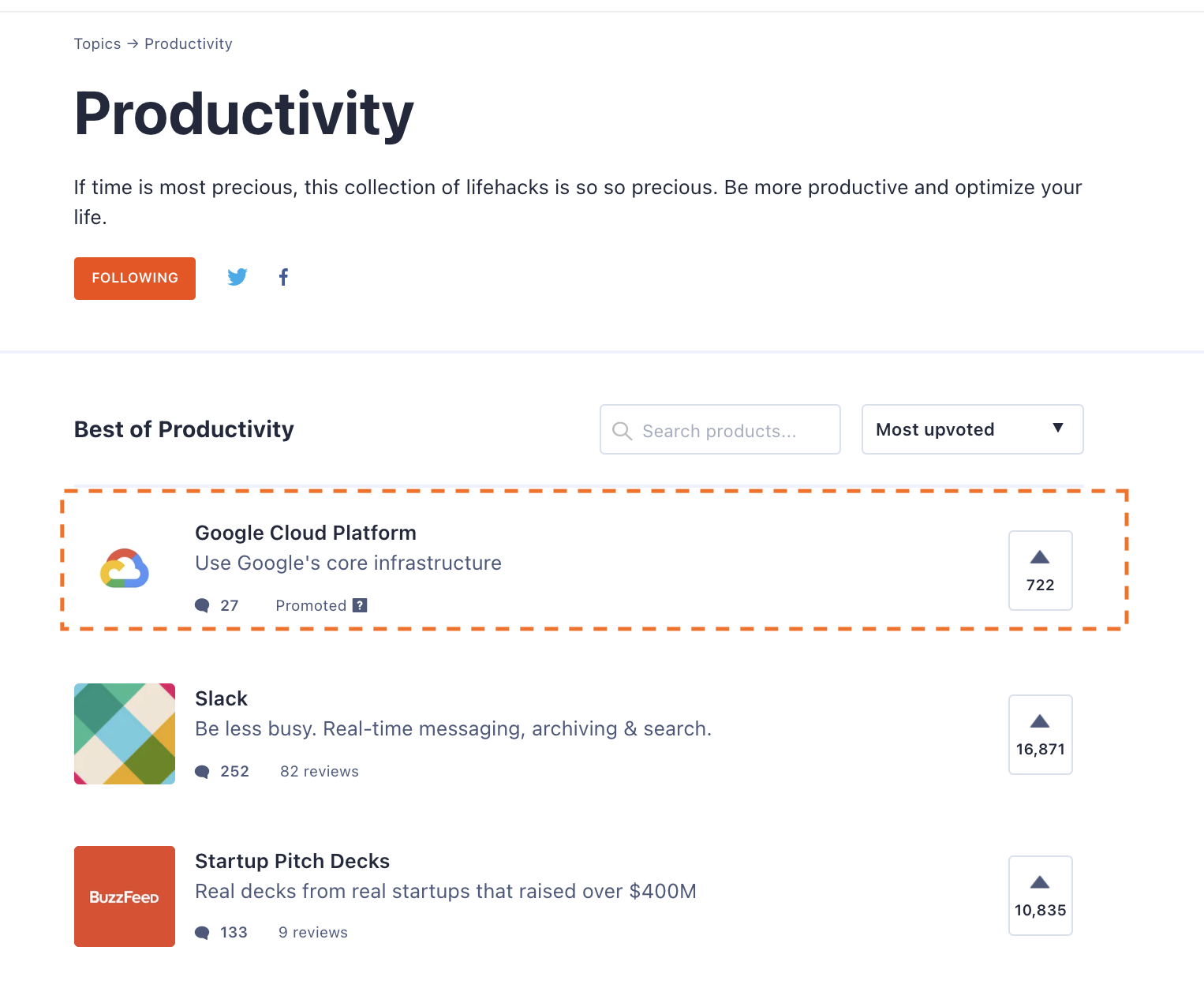 Product, Topic & Collection Pages: This static web display ad is shown across different high traffic points on Product Hunt. You can see an example of what this looks like with Snowflake & Google Cloud below (other examples attached as well);