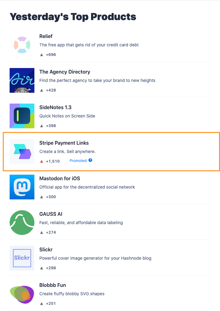 - In the list of popular products from the day before. This works well for promoting your product as this is our most popular section in the newsletter. Here is an example with Stripe as the sponsor;